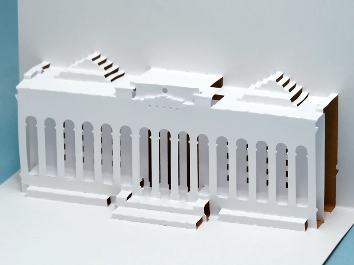 Wikipedia によると、西側の庁舎が1933〜38年に建てられ、東側(大通り側)の庁舎は1946〜53年に建てられたとあった。このポップアップカードの庁舎は東側の建物なので、1953年に竣工したということになるが、詳しいことを調べられなかった。