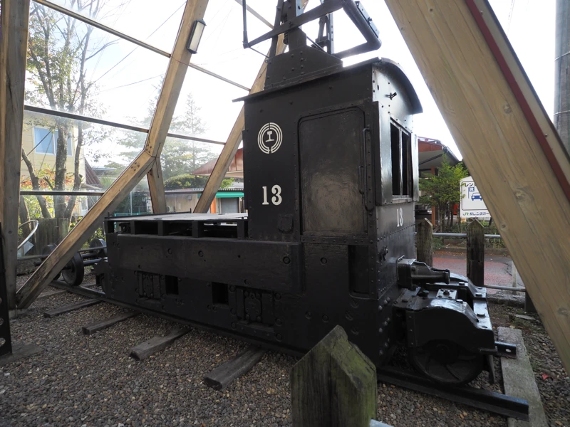 この機関車はデキ12形機関車といいアメリカのジェフェリー社で大正9年(1920)に製作されたハンドブレーキ常用、非常用電気ブレーキ付きという鉱山用のトロッコを改造したものである。