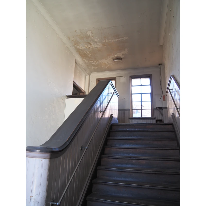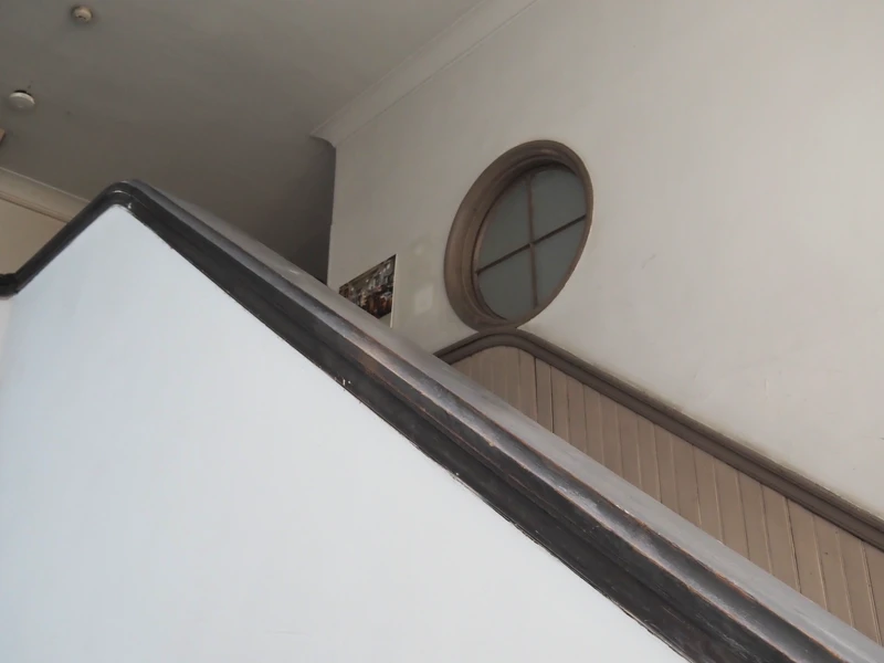 階段を上りながら二階を見上げている。階段横の壁には円窓があるが、この形は建物の正面左右の窓でも使われている。