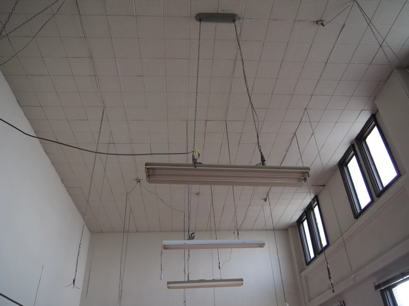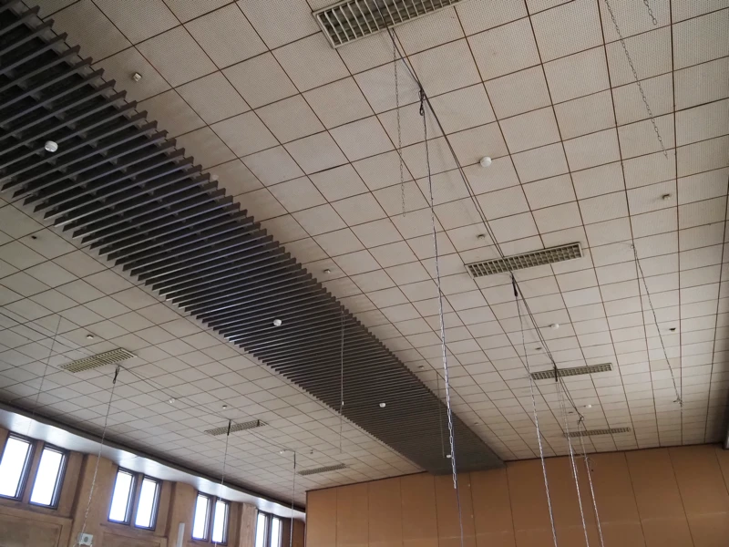音についての問題は議場も同様で、議場は天井のほか壁にも吸音材を貼った。これは議場の天井の様子。