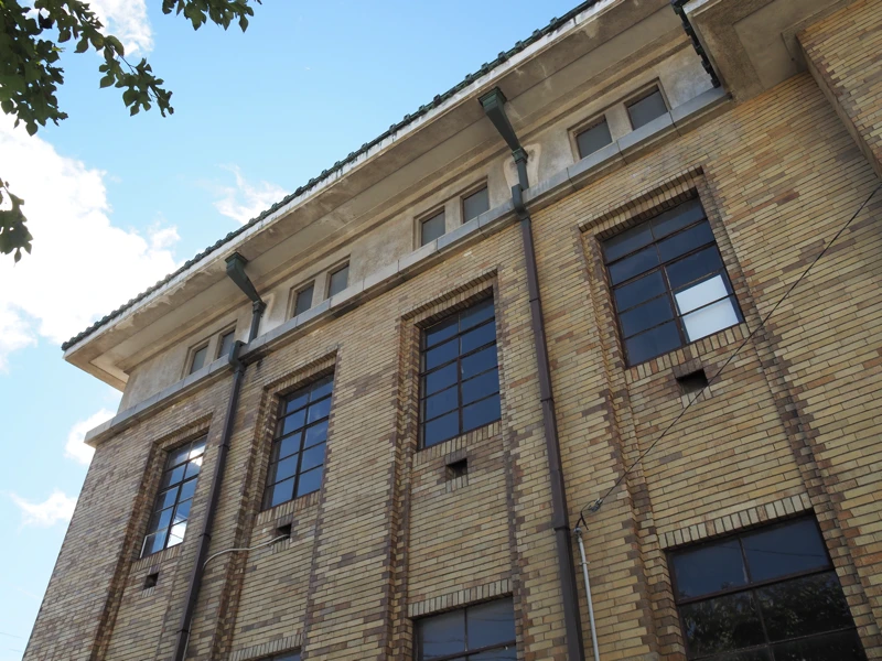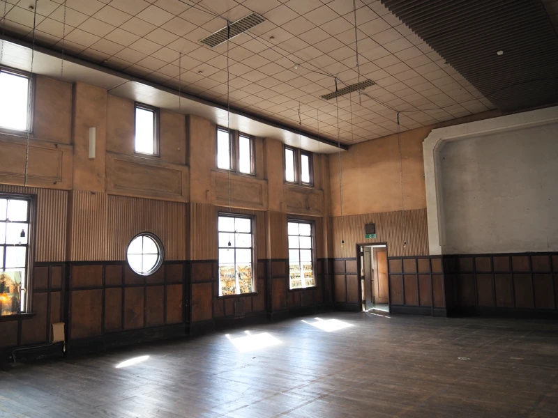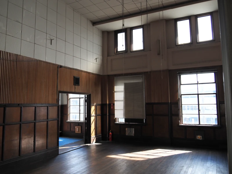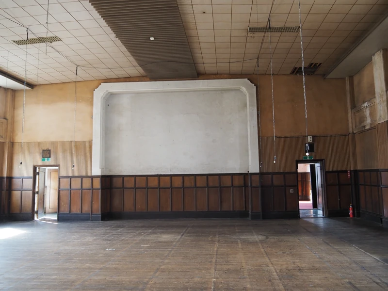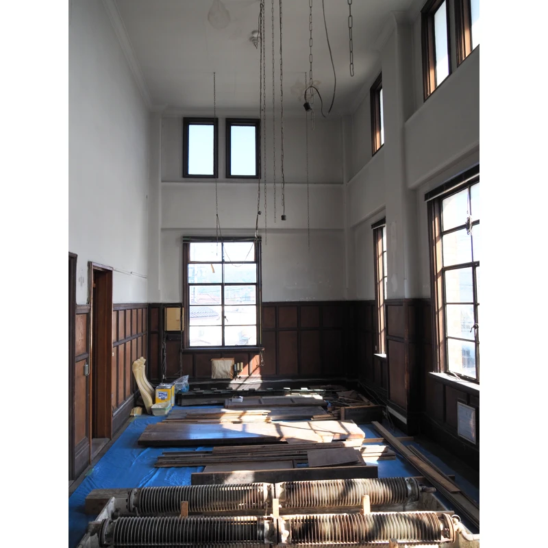 議場の東側を見ると、不自然な壁がある。これはあとで事務室として使うために間仕切りとして壁を作ったのだそうだ。
