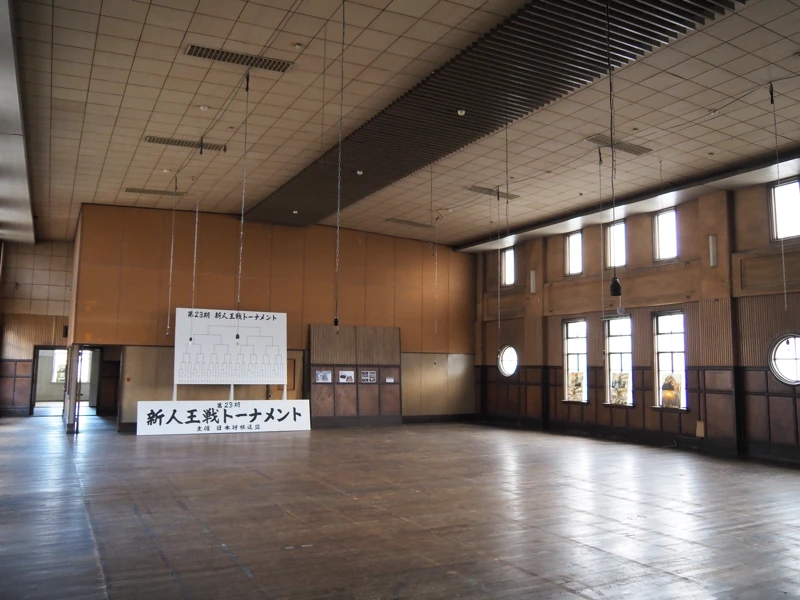 新人王戦トーナメントと書いてある白いパネルと、すぐ右にある茶色のパネルは、映画撮影に使われたセット。