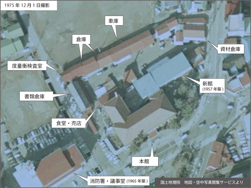 1975年撮影の空中写真で位置を確認できる。本館の北東側に接続されている建物がそれだ。