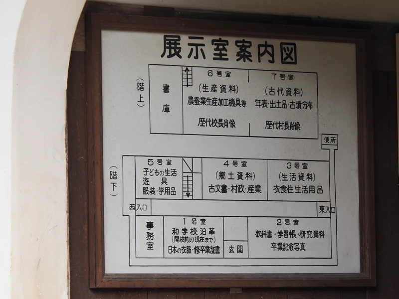 今回は内部を見学していないが、西玄関の壁に展示室の案内図が掲示されているのでおおまかな構造は分かる。1階は中央に廊下があってその南北に教員室や教室が配置されていた。