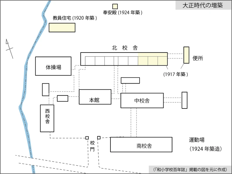ほかに、教員住宅(独身寮とも呼ばれた)が1920年(大正9)に体操場の北側に、奉安殿が1924年(大正13)に建てられた。