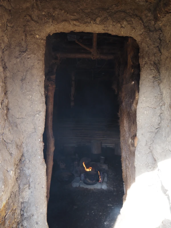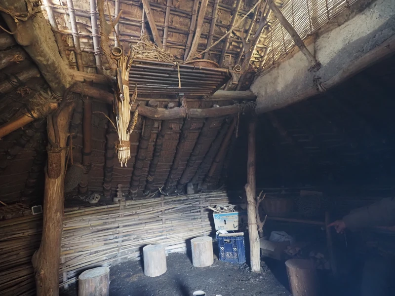 4本の柱が立ち、その中央に炉がある。住居の下部には竹を組んで張り巡らせてある。