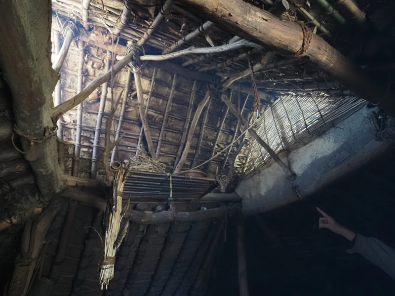 上を見上げる。叉首を組んでその上から樹皮を張ってあるのが見える。