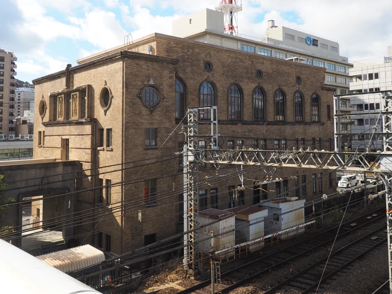 建物の北側には線路があるが、歩道橋の上から建物の姿を見ることができる。