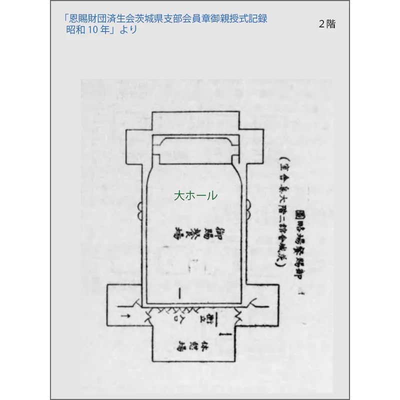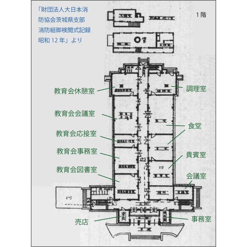 こちらは1階。1937年に消防協会茨城県支部の検閲式が開催され、その記録にこの図があった。(皇族が参加したので、準備の段階から細かく記録がまとめられている。)