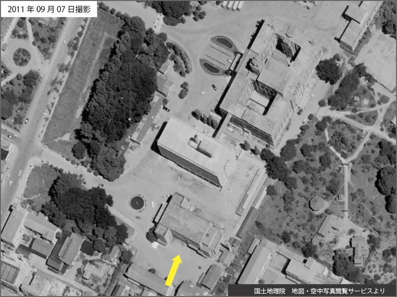 解体前の姿が空中写真で見られる。矢印で示した建物が茨城会館だ。