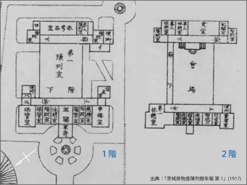 1階は中央に第一陳列室、その奥に第二陳列室と参考品室を設け、正面側は玄関の左右に事務室や応接室、保管室などの部屋を作った。