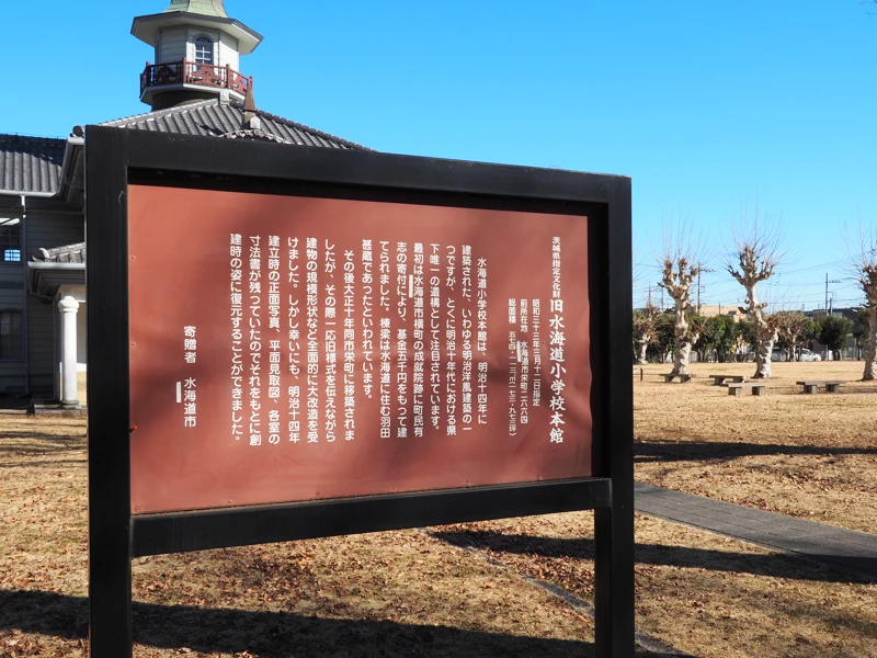 この校舎は1881年(明治14)に水海道駅(現在の常総市の一部)に建てられていた水海道学校を移築したものである。(水海道駅と書くと鉄道駅を連想してしまうが地名である。水海道駅村というようなニュアンスなのだと思う。1889年(明治22)から水海道町という名称になった。)