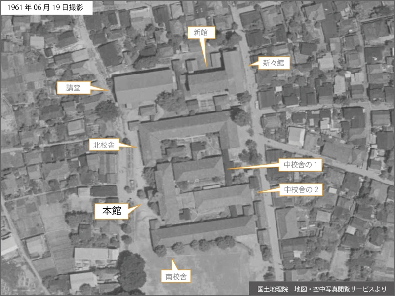 本館は西向きに建ち、背面には2棟の中校舎が接続されていた。それらを北校舎と南校舎で囲み、さらに北側に講堂があった。新館・新々館は後で建てられたのだろう。