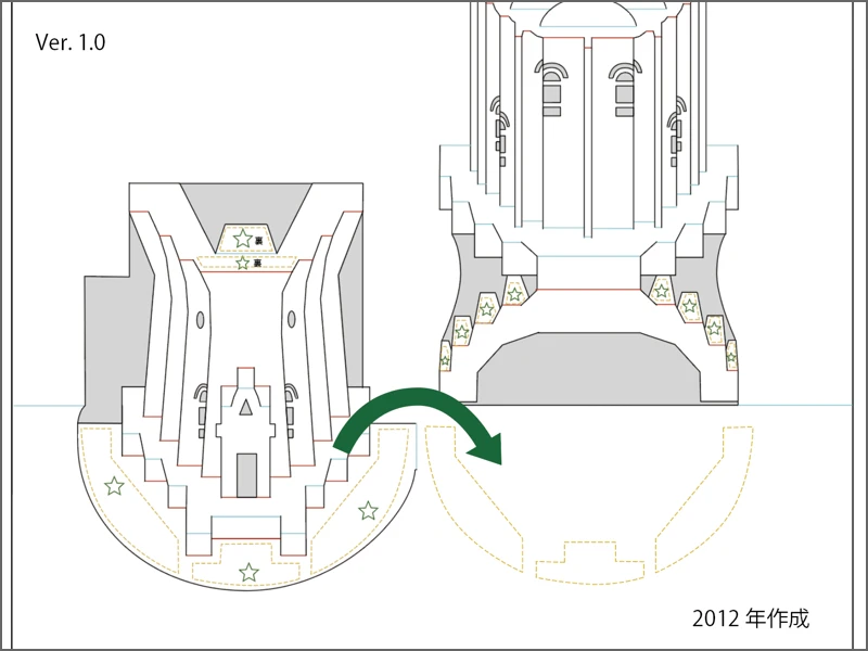 当時は1枚の紙に収めることを優先していたので、図のように1枚の紙の中に配水塔の上部と下部を別々に作って、折り曲げて合体させる…なんてことをしていた。