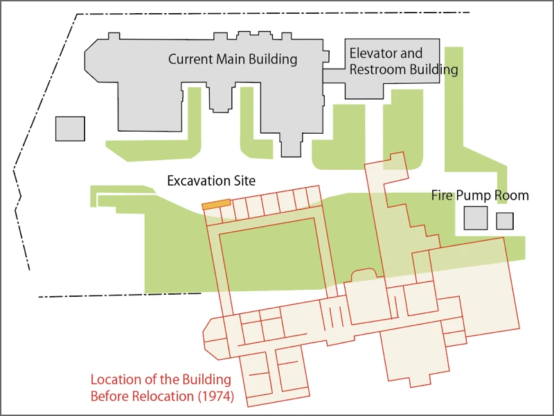 This spot is directly in front of the main building. The reason the bathhouse remains are located here is because the main building was moved northward in 1974.