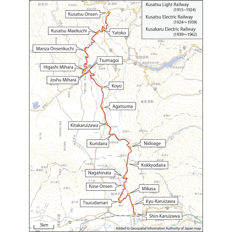 The Kusakaru Electric Railway connected Karuizawa in Nagano Prefecture with Kusatsu Onsen in Gunma Prefecture. Its lines opened sequentially from 1914 to 1926.