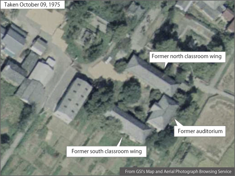 For convenience, these classroom wings are referred to here as the North Wing and South Wing. An aerial photograph from 1982 shows a different building on the site of the South Wing, indicating the old South Wing was likely demolished after 1975.