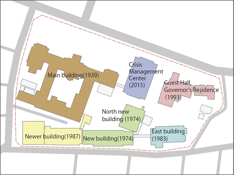 Currently, the Newer Building (built in 1987), the New Building (1974), and the North new building (1974) connected to the northeast corner of the New Building are located south of the Main Building. The East building (1983) is east of the New building, and the Crisis Management Center (2015) is east of the Main Building. East of that stands the Shiga Prefectural Government Guest Hall and Governor’s Residence (1993).