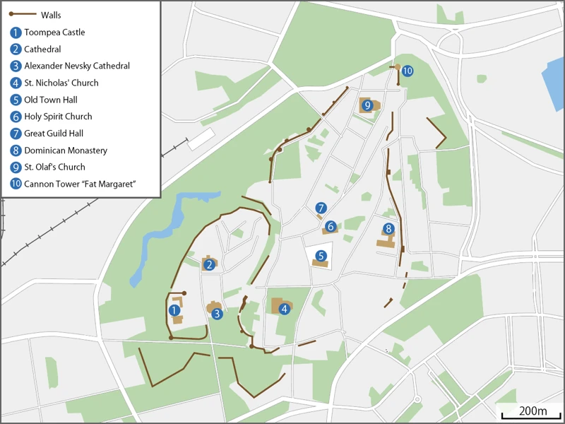 The Old Town is enclosed by approximately 2.5 km of city walls and is divided into Toompea, the hilltop area where nobles resided, and All-linn, the lower town where merchants and craftsmen lived.