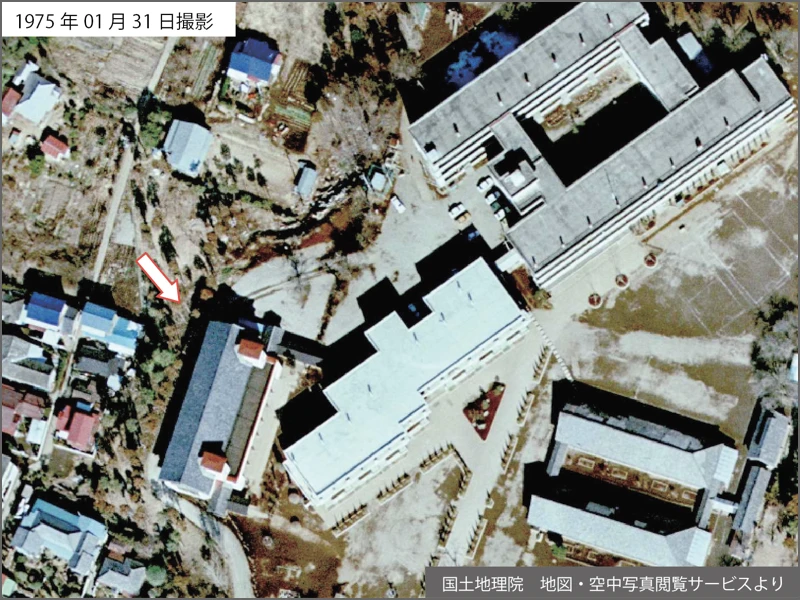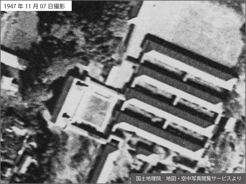 最初に書いたように、現在の講堂は移築されたものだ。移築前の様子を空中写真で見てみよう。現在はバルコニーが南(南南西)を向いているが、移築前は東(東南東)を向いていたのだね。