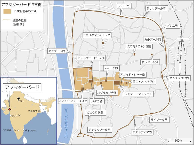 アフマダバード旧市街の地図を見ていただこう。