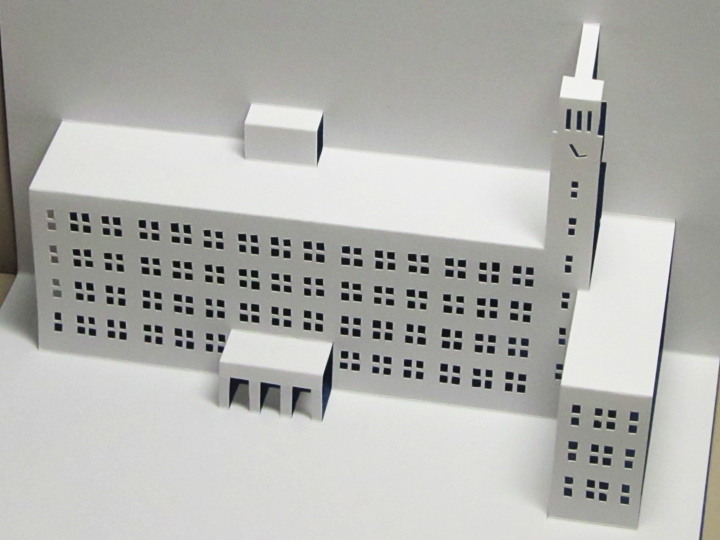 市役所庁舎竣工。設計は元田稔。このときは本館が三階建、向かって右側の東館は二階建だった。時計塔は、建物の目印であると同時に、防空警備の目的もあった。