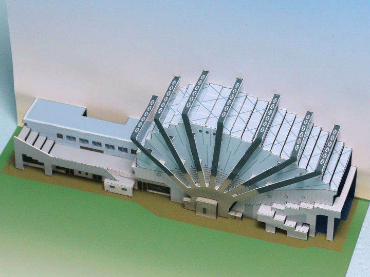 2階屋上部分に楽屋や大道具庫などを増築。(今回のポップアップカードは増築後の姿で製作しました。)
