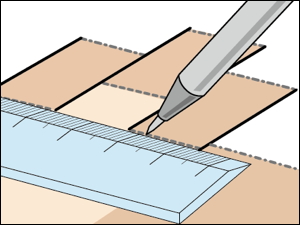 折りやすいように、紙にスジをつけます。定規を当て、折線に沿って書けなくなったボールペンや鉄筆など先のとがったもので、少し力を込めて線を引きます。