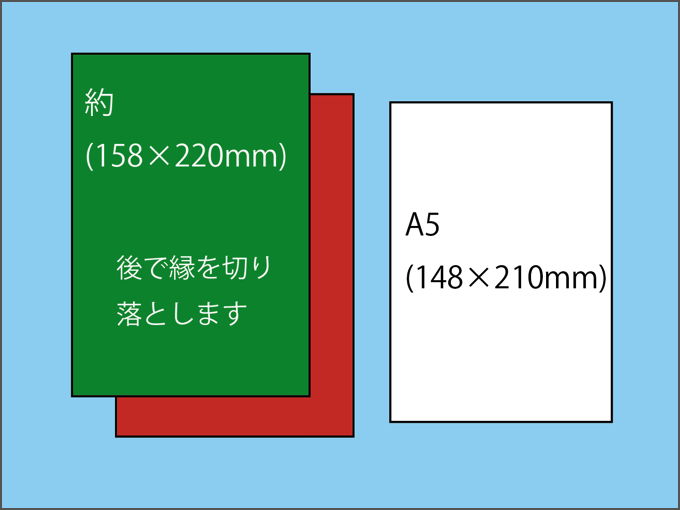 今回はA5サイズのケント紙1枚と、色画用紙を2枚使います。色画用紙は、A5より大きめにしておいて、最後に切りそろえます。
