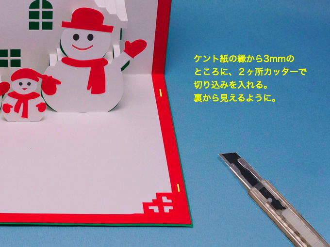 ケント紙の縁から3mmを測り、カッターで小さな切り込みを2つ入れ、目印をつけます。裏から見て、切り込みの位置がわかるようにしてください。
