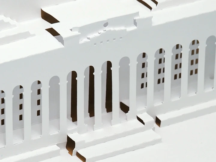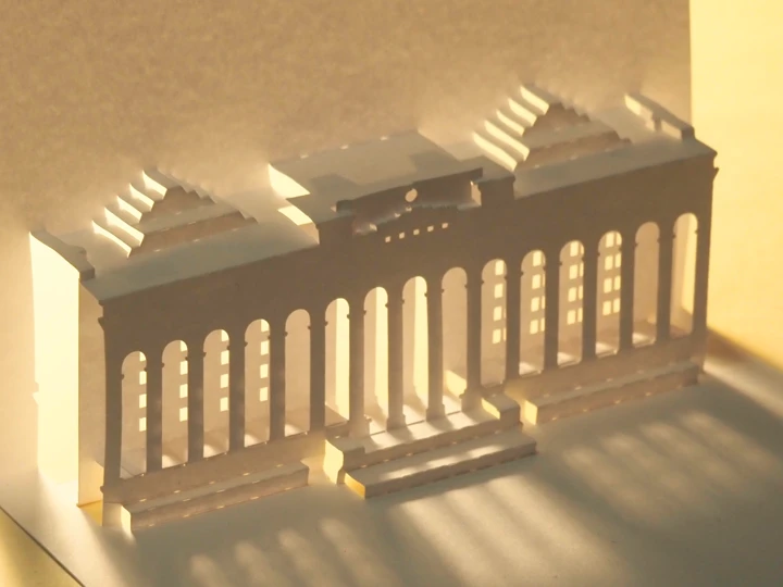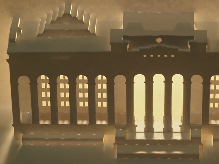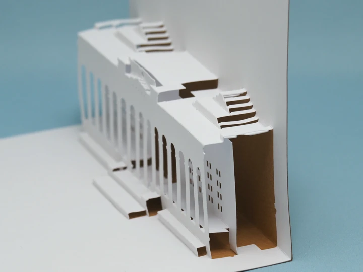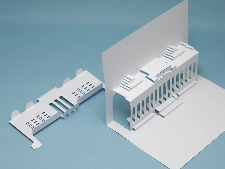 Wikipedia によると、西側の庁舎が1933〜38年に建てられ、東側(大通り側)の庁舎は1946〜53年に建てられたとあった。このポップアップカードの庁舎は東側の建物なので、1953年に竣工したということになるが、詳しいことを調べられなかった。