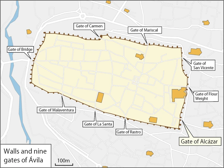 The walled city of Ávila, located west of Madrid, features fortifications whose construction began around the late 11th century (or the 12th century). The walled area and the churches surrounding the walls are designated as a UNESCO World Heritage Site.